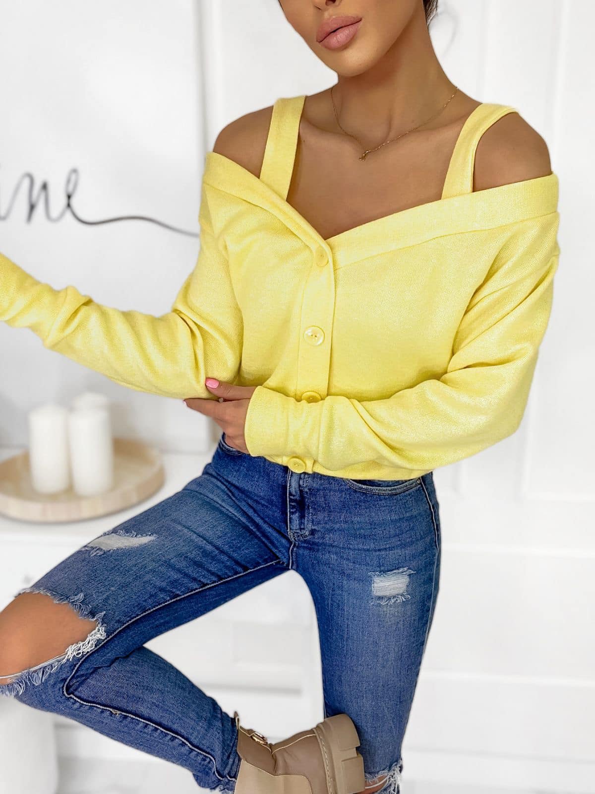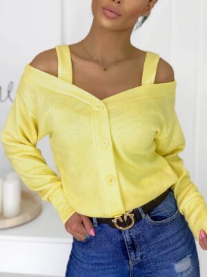 F027 Sárga ejtett vállú pántos pulcsi