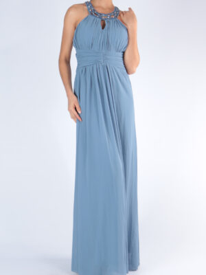 R175 Farmerkék háton gyöngybetétes hosszú alkalmi ruha